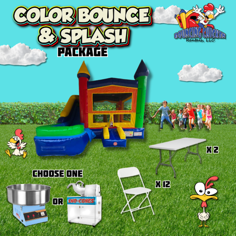 Color Bounce and SplashColor Bounce and Splash Package:Color Bounce and Splash1Dropdown13168523_30494791100Color Splash Combo — a vibrant, all-in-one inflatable play center that turns any party into a splash of color and nonstop fun. This combo features a roomy bounce area with soft inflatable obstacles for kids to jump around and weave through, plus a built-in climbing wall that leads to an enclosed slide for a safe, exciting descent. Bright mesh windows on all sides keep the interior airy and visible so adults can easily supervise. Rugged vinyl construction and reinforced seams make it durable, and the low-entry step with safety flap helps kids get in and out confidently. Perfect for birthday parties, family gatherings, school events, or community functions where you want active play and easy supervision in one eye-catching inflatable. RENTAL TIME FRAMES