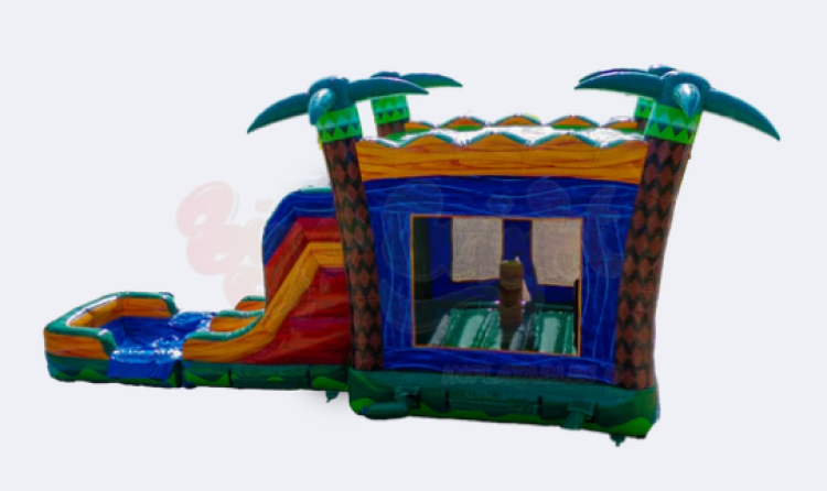 The Crooked Palms Combo offers a unique twist for any event. With its eye-catching design and built-in features, it turns a regular party into a playful tropical adventure that's sure to keep everyone entertained. Built-in features include two playful popups, a basketball hoop, large bounce area, and a dual lane slide. Available for use either wet or dry, with a deep splash pool or an inflated bumper. Recommended occupancy: 6. Recommended age: 3+ years old.